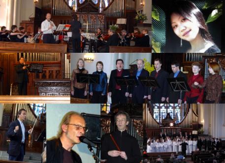 En haut : de gauche à droite : L'orchestre Arioso et Vincent Martinet, Eunile Lee, harpiste, au milieu : Fabrice Brohet, trombone, l'ensemble vocal Huit de C(h)oeur, en bas : Philippe Jegoux, violon, Michel Schaeffer, chanteur chrétien, Philippe Leclercq, flûtes à bec, et la Maîtrise de la Cathédrale